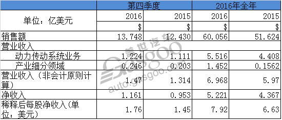 盖世汽车讯 据利纳马官方发布的数据显示,其2016年销售额再创新纪录,呈现出两位数的增长。 2016年财收亮点 2016年销售额同比增长16%,达到60亿美元;营业收入同比增长17%,达到6.968亿美元;净收入同比增长20%,达到5.221亿美元,而稀释后每股收益同比增长20%,达到7.92美元;动力传动系统业务创下的营业收入同比攀升25%,达到5.516亿美元,而销售额同比增长也达到19%。 第四季度营收亮点 2016年第四季度的销售额为13.748亿美元,与2015年同期(12.43亿 美元)相比增长1.318亿美元; 第四季度,动力传动系统业务的销售额同比增长了1.296亿美元,销售额的增长主要来源于2016年第一季度收购Montupet公司,并且在亚洲和欧洲又发布了新的项目,从而在一定程度上抵消了部分汽车业务产量下滑以及北美和欧洲地区商务车业务销售额下滑产生的损失; 在工业细分领域,利纳马第四季度的销售额同比增长1.5%,达到1.447亿 美元; 2016年第四季度,利纳马的营业收入为1.47亿美元,与2015年同期(1.314亿美元)相比增长0.156亿美元; 此外,利纳马第四季度动力传动系统的营业收入与2015年同期相比增长了1130万美元。
