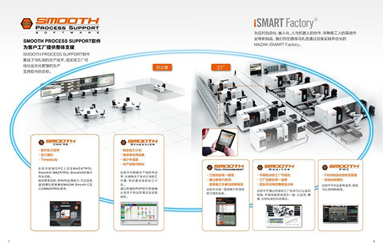 山崎马扎克:智能化工厂管理系统 马扎克i Smart Factor结合最新的信息通信技术和数控技术,采用了最新的软件信息系统,从产品销售、设计、制造、运维等全过程满足客户个性化需要。利用SMOOTH PROCESS SUPPORT智能化工厂管理软件,实时掌握生产动态,可以通过软件将信息技术用于产品设计、制造以及管理等全生命周期中,使得工艺、程序、计划等生产准备提前展开。从产能设计到制造,柔性化的生产线支撑,实现多品种产品生产的动态配置资源,助力实现工业4.0。