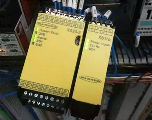 现场应用图 XS26-2用于光幕的屏蔽控制: - 用于光幕的屏蔽控制,屏蔽时间可通过软件设置; - 输出点接屏蔽指示灯,当屏蔽信号触发时灯亮,光幕被屏蔽; - 扩展XS1ro继电器模块