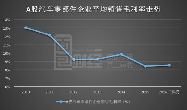 当中国的汽车销量在2016年继续以两位数增长,并远超美国蝉联“世界冠军”之时,汽车产业链上的重要一环——国产汽车零部件企业的毛利率却持续走低。