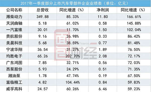 但中国核心汽车零部件行业,大部分却被外资掌控。据调查,目前合资整车厂的一级供应商中90%以上是外资或合资零部件企业。不仅是外资、合资品牌车,就连自主品牌车的部分核心零部件也大都来自外资企业。 不过,近年来,多家汽车零部件企业业绩增速迅猛,汹涌的海外并购热潮正在汽车零部件行业日益澎湃。据统计,自2013年以来,中国零部件企业在海外并购的花费超过140亿美元,折合人民币超过千亿元。这其中已经诞生了涨幅超过300%的大牛股。 今年前4月,中国乘用车销量增速已下降到不足2.5%;汽车销量高增长时代正逐渐结束,但在汽车零部件深度国产替代的背景下,中国的汽车零部件行业或许将产生新的巨无霸。 汽车零部件企业业绩不俗:多家企业利润创新高 多家港股上市的汽车零部件公司业绩都创下了记录。 德昌电机(0179.HK)是一家电动电机、动力子系统及相关机电部件的汽车零部件制造商,2017财年,其汽车相关产品的销售占比为78%。2017财年(2016年3月底—2017年3月底),总营收为27.76亿美元,同比上涨24%;净利润为2.38亿美元,同比上涨38%。 主营汽车转向系统和传动系统的耐世特(1316.HK),2016年净利润为2.94亿美元,同比大涨43.47%。 多家在A股上市的汽车零部件企业近期业绩也表现不俗。下表为面包财经列出的2017年一季度部分上市汽车零部件企业业绩表: