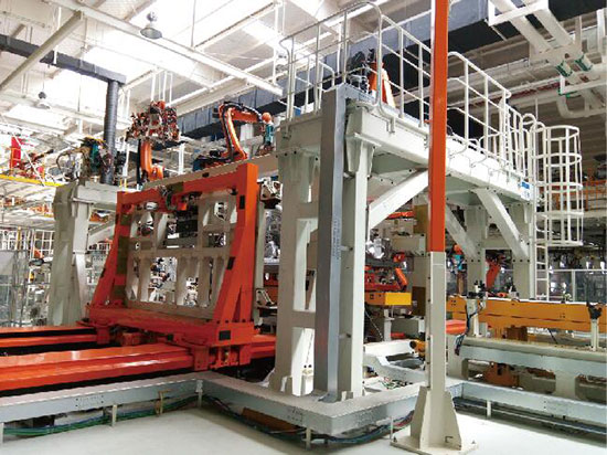 君屹(展位号:E3-C10)的Opengate总拼侧围切换主要靠左右侧部工装对车身侧围进行精确定位,机器人进行焊接。通过左右侧部工装的更换,实现多种车型在同一总拼工位生产是该结构的最大亮点。由于Opengate侧部工装更换较快(行走机构速度1.5m/s),机器人仅进行焊接,生产能力强,最大可达48-60JPH的生产能力。整套定位机构由左、右侧部工装、底部定位工装、滚床及车身自动升降装置构成。工装的刚性较好,不易产生变形,稳固可靠,定位较为精确。
