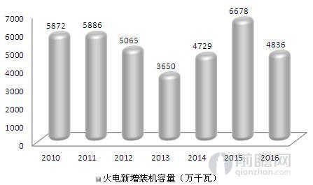 我国大型锻件行业一直处于供不应求的局面,行业市场规模处于稳定增长态势,下游需求带动增长是行业规模扩增的核心原因之一,具体来看,主要下游市场包括火电设备领域需求、风电设备领域需求、船用设备领域需求、水电设备领域、核电设备领域、石化设备领域、冶金设备领域、航天航空设备领域等。 一、火电设备领域需求情况 1、火电新增装机容量情况 从整个行业来看,我国火电新增装机容量尽管没有处于持续上涨态势,但是整体上仍处于较高水平,2016年我国火电新增装机容量也达到了4836万千瓦。 图表:2010-2016年全国火电新增装机容量(单位:万千瓦)
