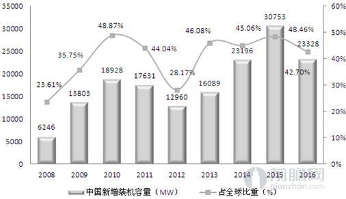 2、火电设备对大型锻件需求情况 我国很早便成为世界上百万千瓦级超临界机组投运最多的国家,火电设备对大型锻件的需求主要表现在汽轮发电机的转子和护环,以及汽轮机中的叶轮与汽轮机转子等方面。 按60万千瓦级以上清洁能源机组占火电机组比重40%,每台大型燃煤机组需要大型锻件230吨计算,从锻件毛坯到成品锻件的收得率按55%计算,仅以火电装机投入60万千瓦级及以上机组计算,2016年火电所需大型锻件大约为2.45万吨。 从我国五大电力集团的最新年限社会责任公报数据来看,火电装机容量增长都保持在较好状态,清洁能源机组占比有所提升,随着火电工艺革新等影响,对于大型锻件行业的技术和产量都提出了更高的要求,将会直接促进大型锻件行业的发展。 根据国家电力发展规划,2020年火电装机达到9-9.6亿千瓦,国内10-15年内将新增单机容量60万千瓦及以上大型燃煤机组620多台。按每台大型燃煤机组需要大型锻件230吨计算,预计国内需求大型火电锻件14.2万吨,年均需求量0.95-1.42万吨。从锻件毛坯到成品锻件的收得率按55%计算,年均需求毛坯锻件1.73-2.58万吨。 二、风电设备领域需求情况 1、风电新增装机容量情况 从我国风电装机容量市场发展来看,我国的风电发展时间要远远短与火电发展时间,尽管整体上风电的装机容量增长仍要小于火电装机容量,但是风电具有非常良好的发展前景,在世界范围内都受到了非常大的重视,前景不可小觑。另外,随着技术的发展,海上风电的发展已经进入高速发展期,能量转换效率高、环保、海上能量较为稳定等因素为海上风电的发展奠定了坚实的基础。 从数据来看,2016年我国风电新增装机容量23328MW,较上年增长有所下降,主要是由于从2012年以来的三年的大幅度增长带来的“后遗症”,中国的风电新增装机容量维持在全球新增装机容量的42%以上,在世界风电行业发展中占有举足轻重的地位。 图表:2008-2016年中国风电新增装机容量及在全球所占比重(单位:MW,%)