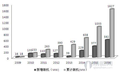 从海上风电发展来看,我国的海上风电发展历程较短,在2009年的时候累计装机容量才达到18MW,远低于平均水平,更不用说跟欧洲等行业发达地区相比。经过7年的发展,到2016年,我国的海上风电装机容量累计值已经达到了1627MW,年新增装机容量也突破了500MW,具有非常大的市场潜力。 图表:2009-2016年我国海上风电新增及累计装机容量(单位:MW)