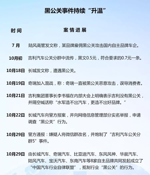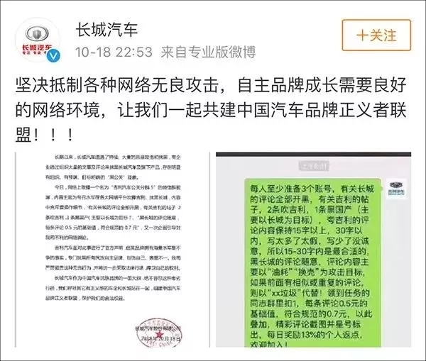 就在轰动一时的“黑公关”事件告一段落时,10月18日,长城汽车在其以分公司长城汽车股份有限公司徐水哈弗销售分公司名义注册的新浪微博上发布声明称,“吉利汽车虽对此事进行了官方声明,但某品牌拥有海量水军是不争的事实,专门抹黑所有民族自主品牌、粉饰自己、表里不一”。