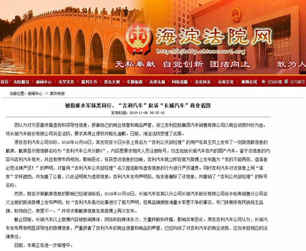 近日,浙江吉利控股集团汽车销售有限公司以商业诋毁纠纷为由,起诉长城汽车股份有限公司,要求其停止侵权并赔礼道歉。日前,海淀法院受理了此案。