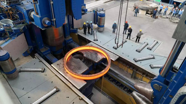 2018年4月18日,全球最大辗环机在济南市章丘区伊莱特股份顺利完成首次热件调试。本次调试历时两天,试制的两个目标外径6米、单重35吨宽边件均一次性顺利成型,环体表面光洁、平整,各项目标数据精准达标。