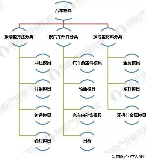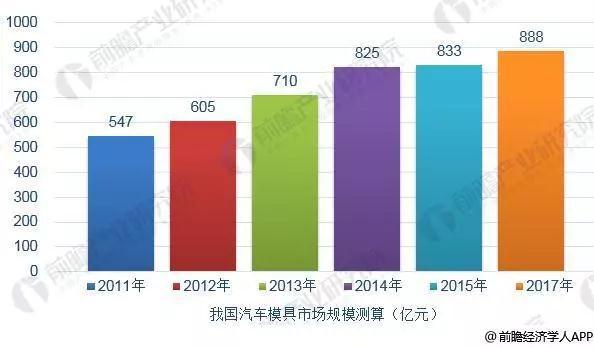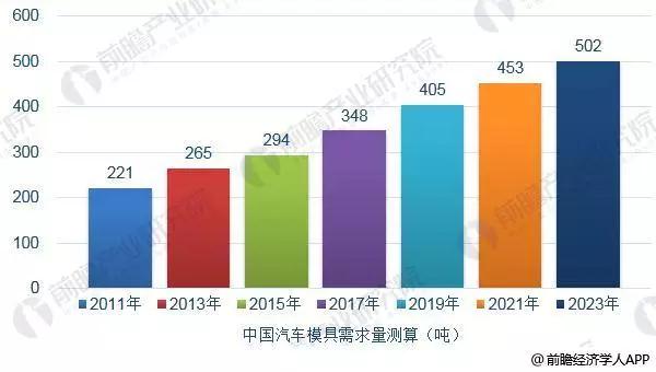 图表1:汽车模具行业产品分类 近年来,我国汽车制造企业每年推出的新车型上百种,这些新车型相当大的一部分是在保持发动机及汽车底盘基本不变的情况下,汽车外观的变化,即车身覆盖件的不断更新,而汽车覆盖件的更新均需要汽车模具作为基础装备,由此对汽车模具产生了巨大的需求。 汽车模具的行业发展与下游行业汽车行业的发展息息相关,下游汽车行业的稳步快速发展将极大推动汽车模具行业的发展。模具属于消耗品,用量较大,汽车行业90%以上的零件由模具成型,同时使用冷作、热作、塑料模具钢,平均每万辆汽车消耗模具0.12吨。一般情况下,制造一辆普通轿车本身便需要约1500个模具,当中有接近1000个的冲压模具和超过200个的内饰件模具。 根据前瞻产业研究院发布的《2018-2023年中国汽车模具行业产销需求预测与转型升级分析报告》测算,汽车模具占模具行业的市场份额约1/3,而根据国家统计局的统计数据,2017年我国汽车模具的销售收入为2663.42亿元,据此测算2017年中国汽车模具市场规模达到888亿元。到2023年,中国汽车产量将达到近4182万辆,年均增速在6.0%左右,而对于汽车模具的需求将达到500吨左右。