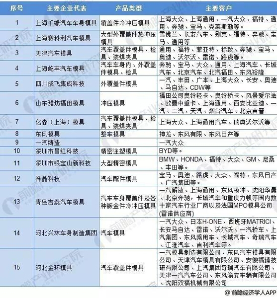 图表4:我国汽车模具代表企业产品及客户介绍(部分) 二是河北兴林车身模具制造有限公司等原有的一些规模较小的模具企业迅速壮大,普什模具、上海屹丰模具等拥有较大投资规模的新兴企业不断涌现,并在市场上抢得一席之地; 三是外来资本积极投入国内模具市场,如丰田一汽(天津)模具有限公司、烟台骏辉模具有限公司等。 根据产品类别及汽车整车厂要求,汽车模具可划分为低端、中端和高端三个档次。其中技术含量低的模具已供过于求,市场利润空间狭小;中端模具市场竞争日趋激烈,而技术含量较高的高端模具还远不能满足市场需求,我国进口模具主要为高端模具,该领域仍具有巨大的发展空间。 |