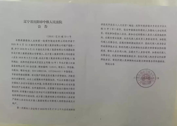 近日,据报道,沈阳市中级人民法院依法裁定受理北方重工集团有限公司破产重整一案,并将于2018年8月17日上午九点在沈阳经济技术开发区工人文化宫举行第一次债权人会议。 北方重工介绍 据官网介绍,北方重工集团有限公司是在沈阳重型机械集团有限责任公司和沈阳矿山机械(集团)有限责任公司合并重组的基础上组建的国有独资公司。2007年并购法国NFM公司后,成为跨国经营企业。2009年进入中国企业500强行列。在国内重型机械行业排名稳居前三。