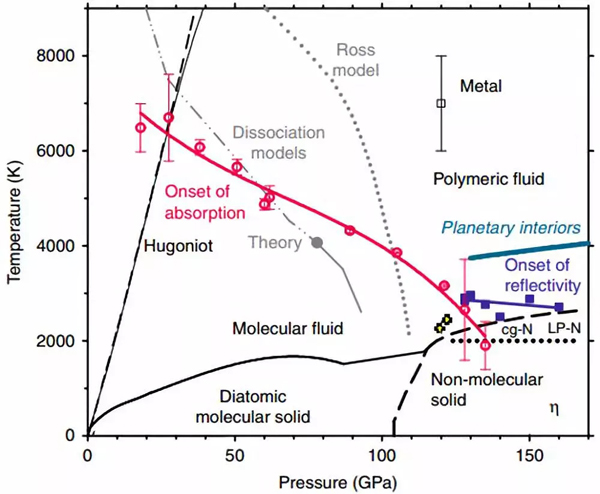 含能材料广义上指蕴含有大量可释放化学能的一类物质,主要类别包括发射药、推进剂、炸药、烟火剂等。绿色高含能材料的合成一直是物理、化学和能源等领域的科研热点方向,其中全氮材料聚合物被认为是五种常规超高含能材料之一。 氮是自然界中含量最丰富的元素之一,氮气占大气总量的78%。通常情况下氮气以无色无味的双原子气体分子形式存在,然而在极端高温高压条件下,氮分子会发生一系列复杂的结构和性质变化,比如分子发生解离进而发生聚合作用形成聚合氮或进一步形成金属氮,这两种形态的氮材料都是典型的超高含能材料,是目前常用炸药TNT能量密度的十倍以上,具有含能密度高、绿色无污染和可循环利用等种种优点,如果能作为燃料应用于载人火箭一、二级推进器,有望将目前火箭起飞重量提升数倍以上。其原子形态“金属氮”的成功合成,更能够为“金属氢”的实现提供重要参考。然而,金属氮并不容易获得,需要高达百万大气压(GPa)的极端高压和几千度(kK)的高温条件。 基于氮气合成高含能材料的研究由来已久,其中高温高压合成方法被证明是最有效的合成方法之一,例如前人在百万以上静态高压环境中通过高温淬火合成的类金刚石空间网状聚合氮 (cg-N) 和层状聚合氮 (LP-N)。然而,鉴于传统的高温高压实验方法和探测手段的局限性,前人的结果仅仅部分地反映了氮在极端条件下的行为,而其由绝缘态的氮分子向金属氮转变的压力-温度-物性全息相图并未被实验研究揭示过。 量子中心科研团队在原有的金刚石对顶砧装置的基础上,引入了脉冲激光加热技术和超快光谱探测方法,建成了集高温高压产生及物性测量的原位综合实验系统。利用综合实验系统,研究人员获取了高达170 GPa、8000 K高温高压极端条件,并在此条件下原位研究了氮分子在绝缘体-半导体-金属转变过程中的光学吸收特性和反射特性,确定了氮分子解离的相边界及金属氮合成的极端压力温度条件范围 (125 GPa-2500 K以上),原位光谱分析研究也进一步证实了实验中确实合成了具有半金属性质的聚合氮和具有完美金属特性的“金属氮”。极端高温高压条件下聚合氮和金属氮的合成,不仅能够对其他形式高能氮材料的合成提供指导,也为未来“金属氢”的成功合成奠定了重要基础。 该项研究得到中组部千人计划、国家自然科学基金委员会、科学挑战专题、合肥研究院项目支持。