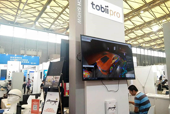Tobii Pro带来的眼动追踪技术体验在展会现场吸引了众多观众和媒体的目光。此技术可应用于VR 环境下观察汽车模型,在实体产品生产前开展测试。通过将眼动追踪与 VR 相结合,可以在完全受控的环境下准确了解被试者每一刻的视觉注意信息。使用者可按研究需要创建任何模拟环境,研究场景可方便、快速地重复利用,经济且高效。
