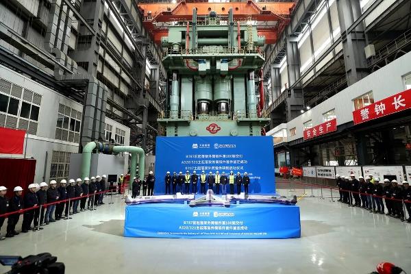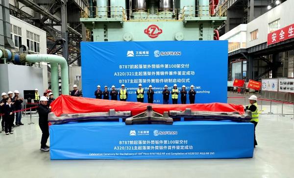 11月12日,8万吨模锻压力机现场,中国二重万航模锻为法国赛峰起落架系统公司生产的第100件波音787前起落架外筒锻件正式发运。中国二重副总经理胡洪在发运仪式上宣布,由万航模锻研发的具有“世界级”超大尺寸和重量的波音787主起落架锻件启动首批生产。同时,万航模锻研制的空客A320/321主起落架外筒通过鉴定。 这一系列重要航空模锻件的研制成功和技术突破,标志着万航模锻已成为国内最大的大型客机起落架锻件制造基地,成为万航模锻全力融入世界航空产业链的重要里程碑。 法国赛峰起落架系统(苏州)有限公司总经理Mr.Mathieu PACAULT在致辞中表示,“今天的成绩显示,万航模锻已经掌握了批量生产大型航空锻件的能力,并做好了服务全球航空市场的准备。” 万航模锻党委副书记、总经理冯彦成在致辞中表示,历经8年的合作,万航模锻收获的不仅仅是订单,而是对标世界级企业的管理能力,交付的也不仅仅是产品,而是不负厚望、不辱使命的重托与信任。万航模锻将持续以创新驱动发展,构筑起民机超大型复杂结构件的技术高地,锻造全球化的品牌, 打造真正具有国际竞争力的航空模锻企业。