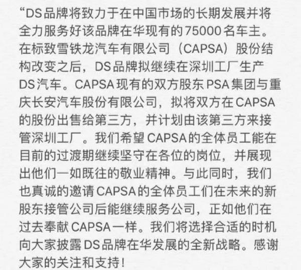 PSA集团中国及东南亚区企业传播总监王超证实了该消息,其回应称,长安PSA的双方股东PSA集团与重庆长安汽车股份有限公司,拟将双方在长安PSA的股份出售给第三方,并计划由第三方来接管深圳工厂。此前曾曝光宝能将全面收购长安PSA,但该消息未得到长安汽车和PSA的确认。