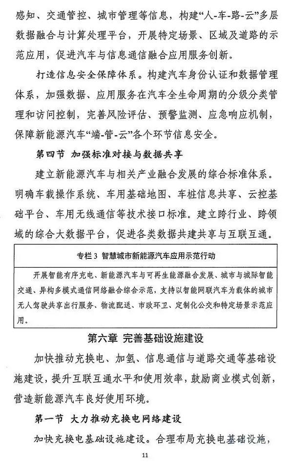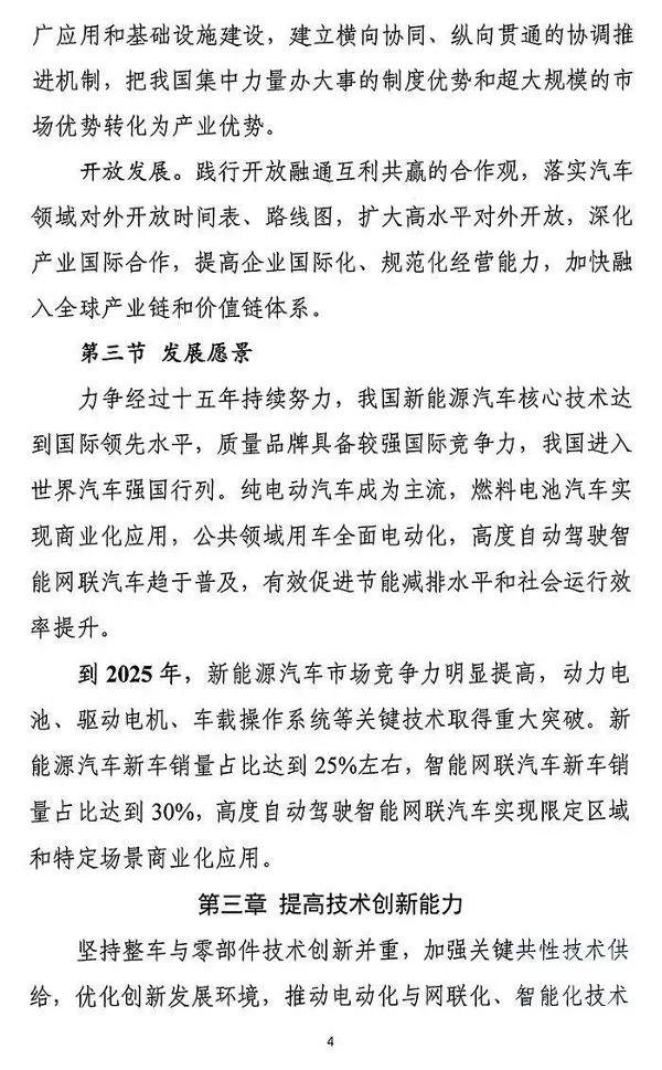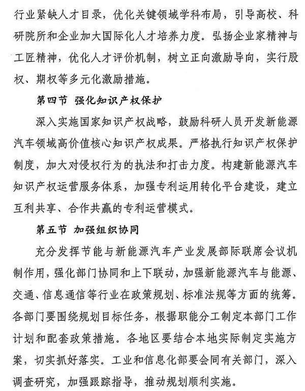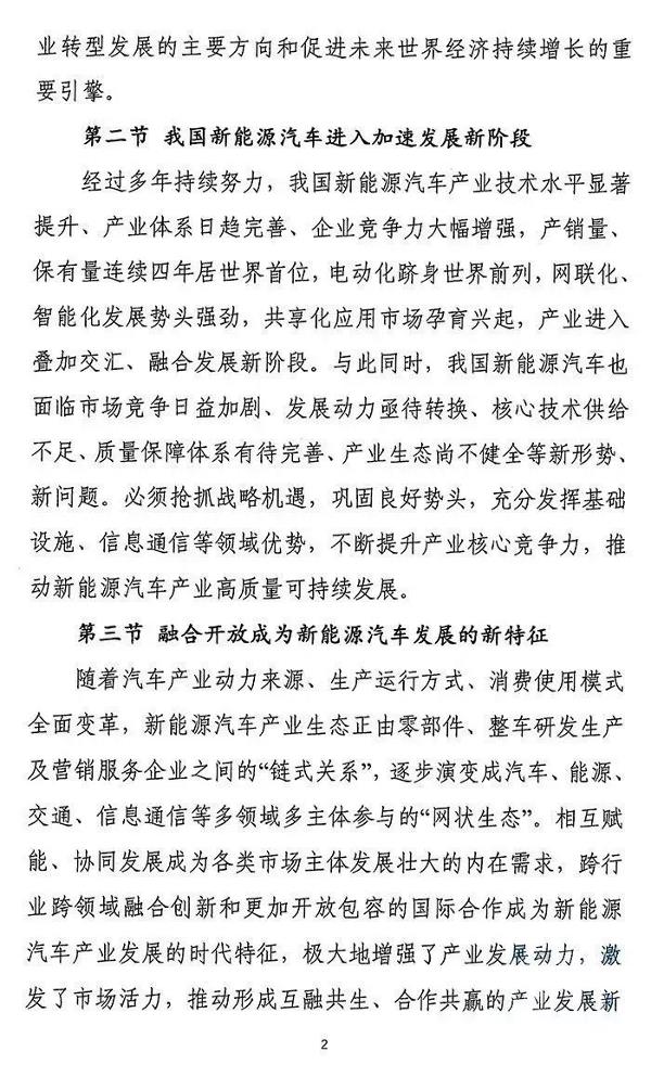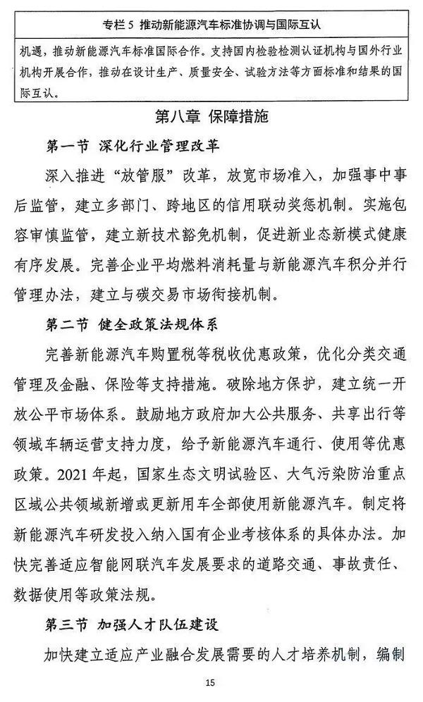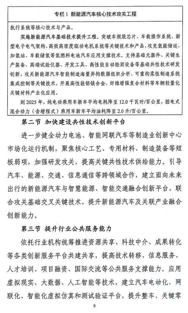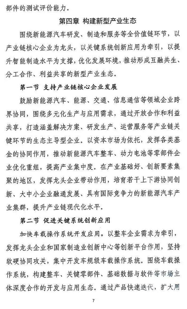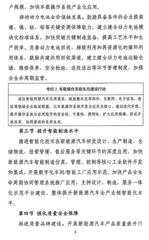 12月3日,工信部正式发布《新能源汽车产业发展规划(2021-2035年)》征求意见稿,为未来十五年中国新能源汽车产业的发展指明了方向,在这份“顶层设计”中,有八大要点值得关注。 一、2025年新能源汽车新车销量占比达到25%左右 当前,在新一轮科技革命和产业变革的推动下,汽车产业加速向电动化、智能化、网联化、共享化转型,汽车产业的能源动力、生产运行和消费使用方式全面重塑,产业发展正在发生重大结构性变化。新能源汽车作为科技创新与产业升级的标志性产品,作为跨界融合的关键节点,也迎来一个全新的发展时代。 自2012年节能与新能源汽车产业发展规划发布实施以来,我国新能源汽车产业发展取得积极进展,新能源汽车创新能力、技术水平不断提升,政策环境、产业布局逐步优化,开放竟合良性发展的生态基本形成,中国新能源汽车产销连续四年居世界首位。 为推动新能源汽车产业高质量、可持续发展,工信部会同有关部门起草了该《征求意见稿》,以“市场主导、创新驱动、协调推进、开放发展”为基本原则,力争经过十五年持续努力,使我国新能源汽车核心技术达到国际领先水平,纯电动汽车成为主流,燃料电池汽车实现商业化应用,公共领域用车全面电动化,高度自动驾驶智能网联汽车趋于普及,有效促进节能减排水平和社会运行效率提升。 到2025年,新能源汽车市场竞争力明显提高,动力电池、驱动电力、车载操作系统等关键技术取得重大突破。新能源汽车新车销量占比达到25%左右,智能网联汽车新车销量占比达到30%,高度自动驾驶智能网联汽车实现限定区域和特定场景商业化应用。 二、 2025年纯电动乘用车百公里电耗降至12度 在鼓励技术创新方面,坚持整车与零部件技术创新并重,加强关键共性技术供给,优化创新发展环境,推动电动化与网联化、智能化技术并行融合发展,持续提升新能源汽车产业创新能力。 1、深化“三纵三横”研发布局我国将继续以纯电动汽车、插电式混合动力(含增程式)汽车、燃料电池汽车为“三纵”,布局整车技术创新链。以动力电池与管理系统、驱动电机与电力电子、网联化与智能化技术为“三横”,构建关键零部件技术供给体系。 2、攻关新能源汽车核心技术包括实施电池技术突破行动和网联技术创新工程。按照规划,到2025年,我国将实现纯电动乘用车新车平均电耗降至12.0千瓦时/百公里,插电式混合动力(含增程式)乘用车新车平均油耗至2.0升/百公里。 三、构建新型业态、鼓励跨界合作 围绕新能源汽车研发、制造和服务等全价值链环节,以产业链核心企业为龙头,以关键系统创新应用为牵引,以提升智能制造水平为支撑,优化发展环境,推动形成互融共生、分工合作、利益共享的新型产业形态。为实现这一目标,将从相关企业、关键系统应用、生产制造水平、品牌建设、安全建设五个方面采取相应措施。 1、支持产业链核心企业发展鼓励企业跨界合作;打造涵盖解决方案、研发生产、运营服务等产业链关键环节的生态主导型企业;推动整车、零部件企业优化重组,提高产业集中度;发挥龙头企业带头作用,培育新能源汽车产业集群。 2、促进关键系统创新应用未来将以整车企业需求为牵引,集中开发车规级车载操作系统。同时,鼓励整车及零部件、互联网、电子信息、通信等领域企业组成联盟,扩大车载操作系统应用规模。 除鼓励上游资源供应商保障资源提供能力外,还将建立健全动力电池模块化标准体系,完善动力电池回收、梯级利用和再资源化的循环利用体系,鼓励共建共用回收渠道,建立健全动力电池运输仓储、维修保养、安全检验、退役退出等环节管理制度,从而推动动力电池全价值产业链的发展。 3、提升智能化制造、推进质量品牌建设下一阶段将推进智能化技术在新能源汽车研发设计、生产制造、仓储物流、经营管理、售后服务等关键环节的深度应用。引导企业强化品牌发展战略,以提升质量和服务水平为重点进行品牌建设。同时,利用互联网、大数据、区块链等技术,健全产品全生命周期质量控制及追溯机制。 4、强化安全保障征求意见稿提出,要强化企业对产品安全的主体责任,落实生产者责任延伸制度。健全新能源汽车整车、零部件以及维修保养、充换电等安全标准,完善安全法规制度。加强新能源汽车安全隐患召回管理工作力度。落实企业负责、政府监管、行业自律和社会监督相结合的安全生产机制,加强安全生产监督管理。 四、推动产业融合,构建“出行即服务” 征求意见稿鼓励推动新能源汽车与交通融合发展。将加快建设涵盖前端信息采集、边缘分布式计算、云端集中管控的新型智能交通管控系统;加快新能源汽车在分时租赁、城市公交、出租汽车、场地用车等领域的应用;引导汽车生产企业和出行服务企业共建“一站式”服务平台,精准匹配个体出行需求,构建“出行即服务”新型交通出行服务模式。 1、推动新能源汽车与能源融合发展在加强新能源汽车与电网(V2G)能量互动的同时,采取措施促进新能源汽车与可再生能源高效协同。鼓励“光储充放”(分布式光伏-储能系统-充放电)多功能综合一体站建设,推动新能源汽车与气象、可再生能源电力预测预报系统信息共享与融合,鼓励地方开展V2G示范应用等。 2、推动新能源汽车与交通融合发展在交通发展方面将在构建“出行