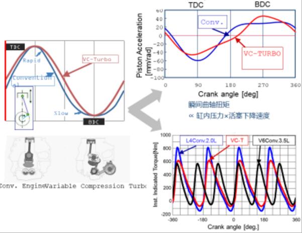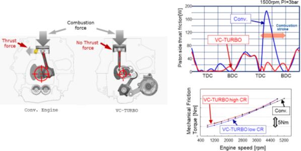 传统发动机活塞与曲轴中心点垂直布置会使活塞产生较大的侧压力,日产VC-TURBO智控引擎独特的多连杆机构,让活塞与曲轴中心点保持偏置减少活塞侧压力,虽然多连杆机构比传统发动机更复杂,但并未因此增加发动机的摩擦力。