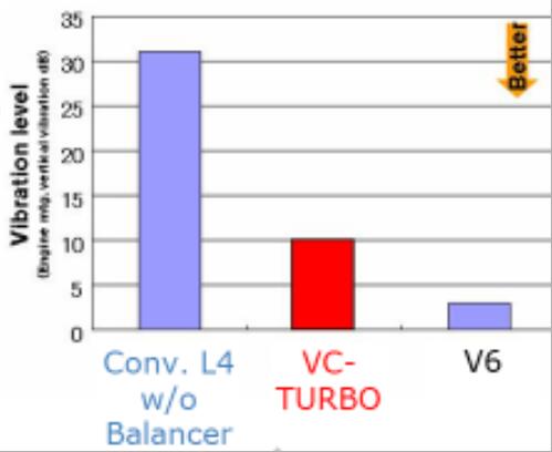 更均匀的活塞加速度以及更大的缸内压力使得VC-TURBO智控引擎(可变压缩比涡轮增压发动机)的振动远小于普通直列4缸发动机,运转平顺性接近V6发动机的水平。