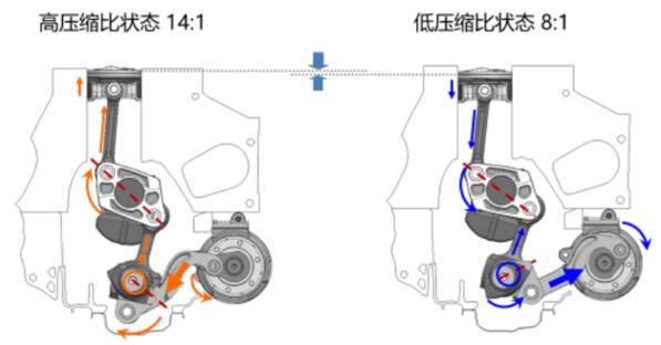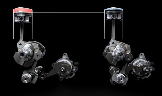 这套巧妙的多连杆机构使发动机压缩比可以在8:1-14:1之间无缝切换,发动机低负荷运转时立即切换成高效率模式,使用14:1的高压缩比提高燃油经济性,当高负荷运转时又马上切换成高性能模式,使用8:1的低压缩比降低爆震增加输出功率。