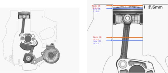通过改变活塞上止点与下止点的位置,燃烧室的容积就可以随之变化,如果活塞上止点往下移动那么燃烧室容积变大压缩比降低,活塞上止点往上移动燃烧室容积变小压缩比提高。