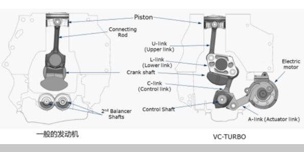 日产VC-TURBO智控引擎的诀窍就在曲柄连杆机构,它在传统的曲轴轴颈上增加了一个多连杆(L-link),多连杆一端接活塞连杆另一端接偏心轴的连杆(C-link),偏心轴(Control shaft)又与右侧的电机控制臂连接(A-link)。电机(Electric motor)顺时针或者逆时针旋转时就会带动控制臂拉伸,使偏心轴的连杆往上或往下移动,恰好偏心轴连杆又与曲轴轴颈上的多连杆连接,通过杠杆原理让活塞可以往上或者往下移动约6毫米。