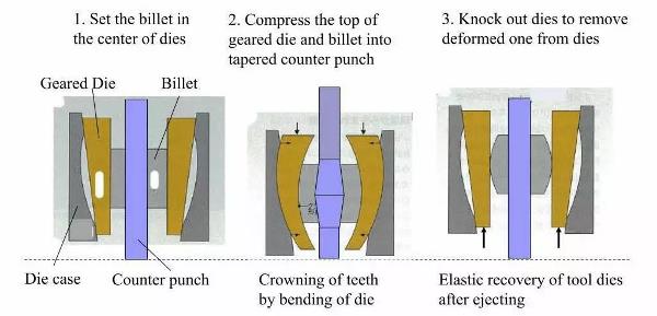 日本Enomoto设备公司介绍了一种冠状齿形的螺旋齿轮的精密成形工艺,主要发明工艺被称为“弹变锻件成形{Elastic Deformation for Forging(EDF),}”,其基本原理是成形齿的模具可以发生弹变,与坯料一起变形,成形结束,成形模具恢复原样,从而实现精密成形齿部。原理如下图。