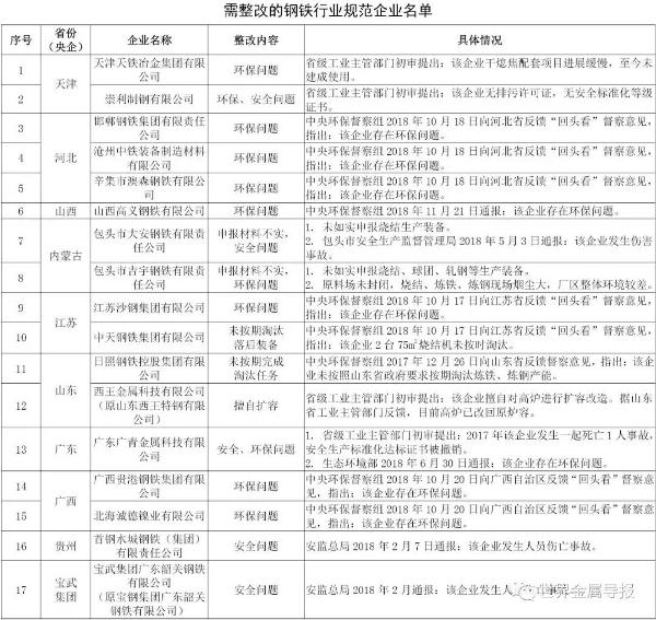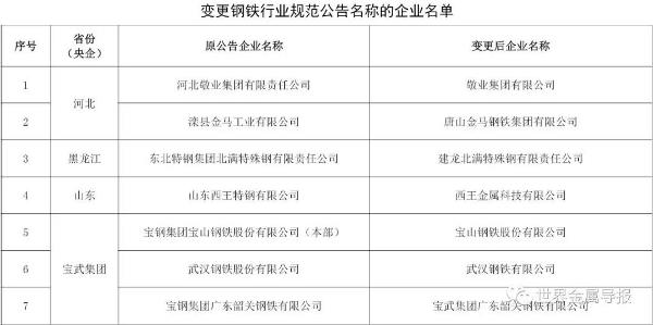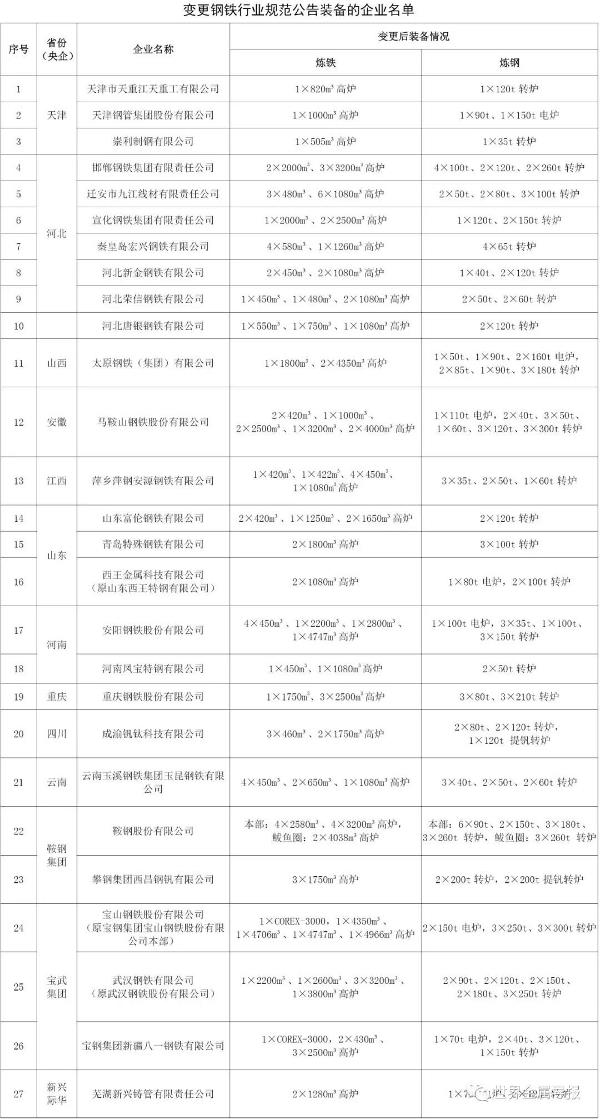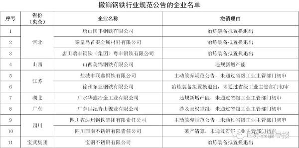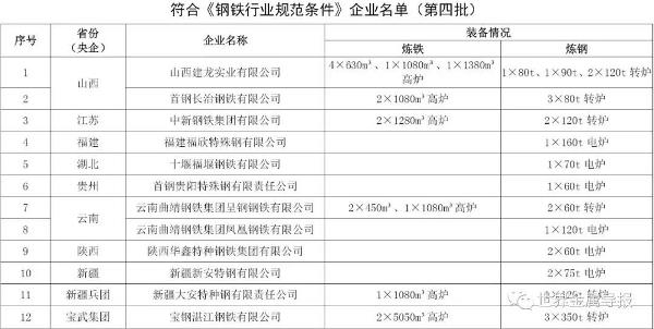 4月3日,工信部公布了符合《钢铁行业规范条件》企业名单(第四批)、撤销钢铁行业规范公告的企业名单、需整改的钢铁行业规范企业名单、变更钢铁行业规范公告装备的企业名单、变更钢铁行业规范公告名称的企业名单。 据统计,新增的第四批符合规范条件的钢铁企业共计12家,撤销规范的钢铁企业共计11家,需整改的钢铁行业规范企业共计17家,变更共计34家(变更钢铁行业规范公告装备的企业27家、变更钢铁行业规范公告名称的企业7家),具体名单如下。