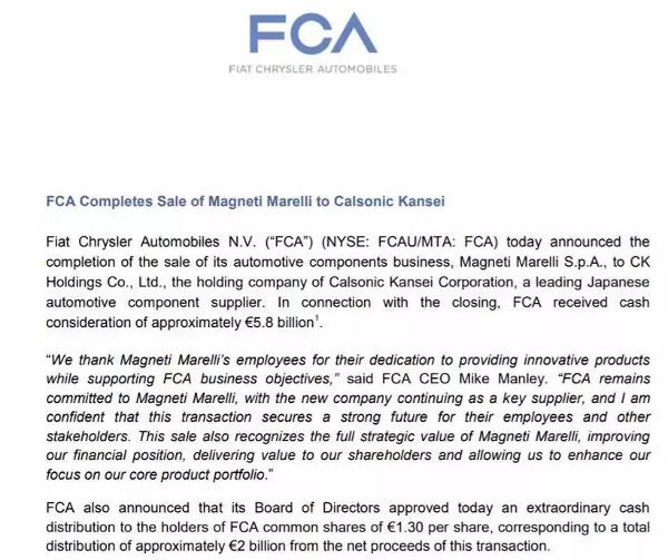 菲亚特克莱斯勒汽车公司(FCA)5月2日发布公告称,该公司已经完成将旗下汽车零部件部门马涅蒂·马瑞利(Magneti Marelli)以58亿欧元(约合65亿美元)出售给日本汽车零部件供应商康奈可(Calsonic Kansei)的项目。该交易价格要低于双方最初同意的价格。