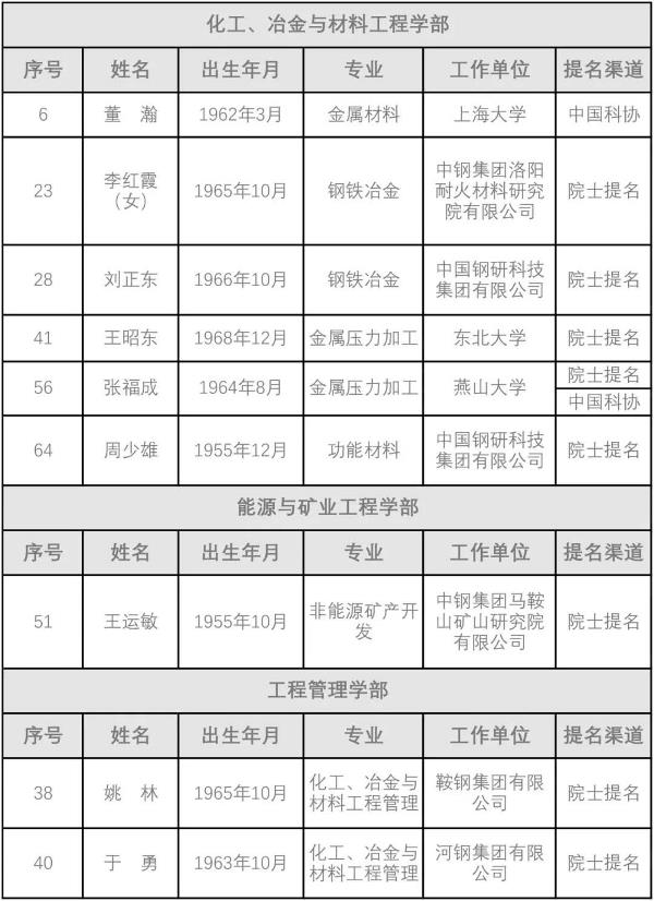 日前,中国工程院2019年院士增选有效候选人名单公布,最终确定的有效候选人共531位。据不完全统计,钢铁行业中,上海大学董瀚,中钢集团洛阳耐火材料研究院李红霞,中国钢研刘正东、周少雄,东北大学王昭东,燕山大学张福成等入选化工、冶金与材料工程学部院士增选有效候选人名单,中钢集团马鞍山矿山研究院有限公司王运敏等入选能源与矿业工程学部院士增选有效候选人名单;鞍钢集团姚林、河钢集团于勇等入选工程管理学部院士增选有效候选人名单。具体如下——