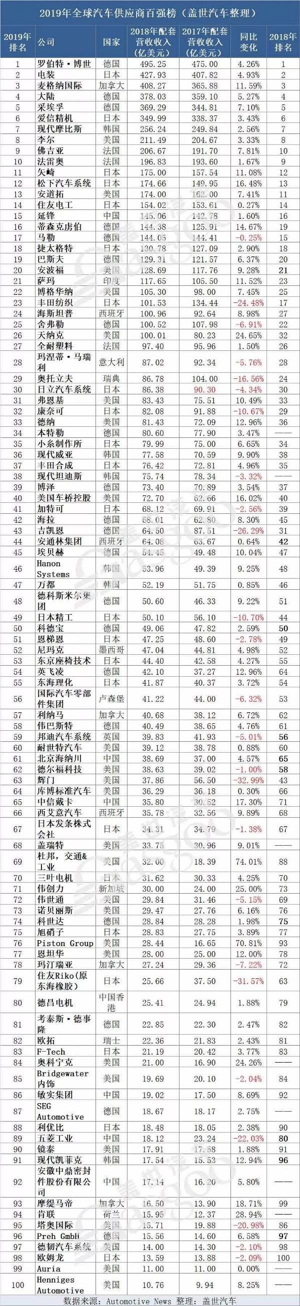 6月24日,《美国汽车新闻》(Automotive News)发布了2019全球汽车零部件配套供应商百强榜。根据最新榜单,博世仍居首位,前十名中八家企业依然维持去年的排名。另值得一提的是,今年共有七家中国企业入围,较去年多一家。延锋依然是排名最高的中国企业,安徽中鼎密封件股份有限公司今年也杀入百强。 中国有7家企业上榜:闯出一匹黑马 今年入围的企业共来自17个国家和地区,而美国企业上榜数超越日本,共有25家企业入围,日本则有23家企业进入今年的榜单;德国今年上榜数与去年持平,有20家企业入围。此外,中国、韩国、加拿大、法国、西班牙分别有7家、6家、4家、3家、3家,而卢森堡、瑞典、墨西哥、瑞士、新加坡、意大利、印度、英国、荷兰分别有1家企业入围。 入围的中国企业数也逐年增加。在今年的榜单上,共有7家中国企业上榜,除了去年上榜的延锋、北京海纳川、中信戴卡、德昌电机、敏实集团、五菱工业之外,安徽中鼎密封件股份有限公司也杀进了榜单。 其中,延锋仍以绝对优势继续领跑中国企业。在今年的榜单上,延锋的排名从去年的第16名上涨至第15名,而北京海纳川的名次为61(上年为65)、中信戴卡为65(上年为71名)、德昌电机为80名(上年为79)、敏实集团为86名(上年为92)、五菱工业为89名(上年为80名)。今年上榜的安徽中鼎密封件股份有限公司总部位于安徽省宁国市经济技术开发区,2018年的配套销售额为17.14亿美元,较前一年上涨5.8%。 需要指出的是,在百强榜中,除了中国本土企业之外,还有一些是中方投资的公司,比如,第89名的SEG Automotive已被郑煤机收购,第98名的Preh GmbH公司为均胜投资集团有限公司在2017年收购的子公司。