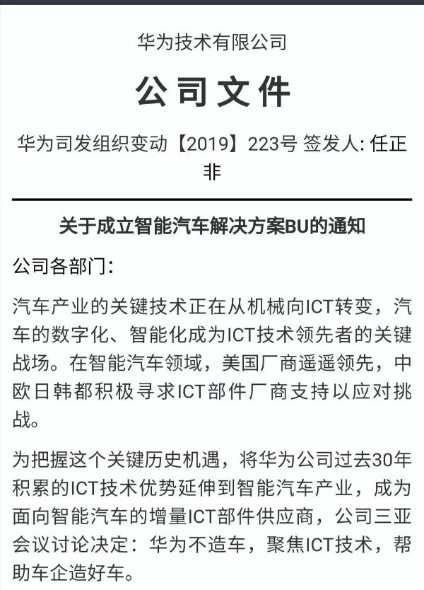 日前,由华为总裁任正非签发的一份内部通知文件流出。《通知》显示,经总裁批准,华为将成立智能汽车解决方案BU,隶属于ICT管理委员会管理。