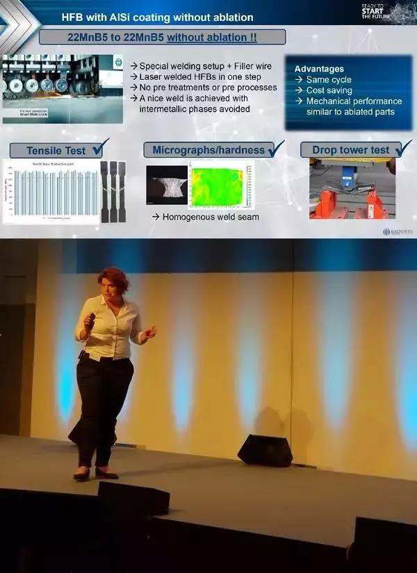 该技术创新了1500MPa与1500MPa铝硅镀层热成形钢间的焊接工艺和技术,直接对带镀层钢板进行激光焊接,而无需去除热成形钢的铝硅镀层,突破了相关专利技术的壁垒,实现了宝钢的解决方案。宝钢激光拼焊德国公司雅娜·冯·海德女士的介绍受到欧洲汽车厂和一级供应商的极大关注。 为了实现该技术的快速突破,宝钢海内外研究团队在已经实现1500MPa+低强度热成型铝硅材料激光拼焊量产供应的基础上,继续在1500MPa+ 1500MPa铝硅热成型材料激光拼焊上同时发力。位于德国的宝钢激光拼焊公司(Baosteel TB)开展以批量生产稳定性为核心的材料、工艺和设备研究与开发;位于上海总部的宝钢研究院着重双新解决方案——新型焊丝+新焊接工艺开发。目前,海内外研究均实现了工业化试验成功的目标。 铝硅镀层热成形钢具有优良的抗高温氧化性,热冲压成形时钢板表面不受氧化,广泛应用于制造热成形零件。但镀层中高的Al含量进入焊缝后,使焊缝性能变差。目前使用的焊接方法是先采用激光消融或其他方法去除铝硅镀层,再进行焊接。消融-焊接方法增加了镀层消融工艺,设备投入成本上升;其次,镀层消融速度低于焊接速度,使生产效率降低,生产成本增加;第三,去除涂层中还产生了较多的粉尘,需要集中收集和处理,增加了生产辅助成本。