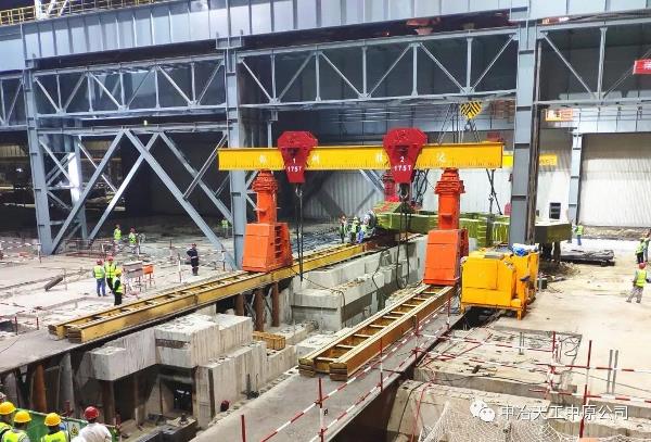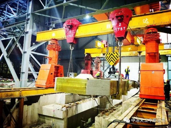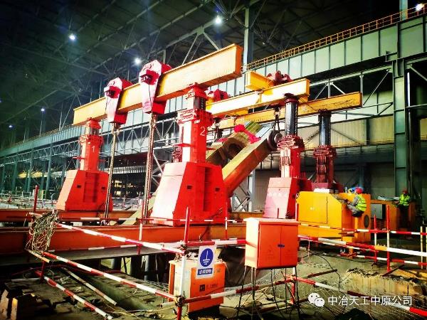 时间紧、任务重,且现场吊装场地狭小,导致吊装难度非常大。项目精细编制了吊装方案,组织了经验丰富、技术精湛的骨干力量,连日加班加点的抢拼,严格施工质量、安全管控。6月25日19:00牌坊进场,项目部全员精心准备、昼夜奋战,现场作业人员紧密合作、积极配合,牌坊卸车、清洗、地面组装、平移、起吊扶正和吊装紧张而有序的进行,历时15个小时,6月26时9点18分,随着最后一个螺丝拧紧,精轧区机第一片牌坊成功完成吊装。