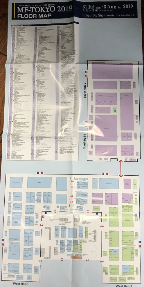 中国锻压协会近些年都参加了世界上涉及锻造、冲压、钣金制作、模具和铆焊相关的展览会,2019年参加了在日本举办的MF-Tokyo展览会,展览会的时间是2019年7月31日-8月3日。展览会占了日本 “东京国际展览中心 TOKYO BIG SIGHT”的南面两个馆和西面两个馆,同时包含了东西两个馆的连接部位,如下图。其中粉颜色的为钣金制作,浅蓝色的为锻造,黄颜色的为冲压。他们把螺钉螺帽、弹簧等标准件、紧固件的成形算作了锻造成形。