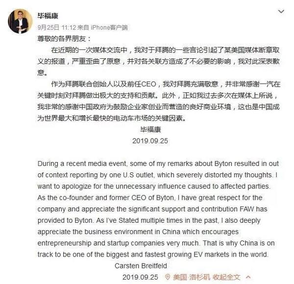 这是拜腾获得的首笔海外股权融资,一汽集团此前已与拜腾签署了投资协议,参与拜腾 C 轮融资。MS Autotech 和 Myoung Shin Co.的母公司是韩国MS明信集团。明信集团在韩国、美国、印度、中国、巴西均设有工厂,为戴姆勒、现代、起亚、雷诺日产、特斯拉等提供零部件。 此前,据 The Verge 报道称,拜腾汽车前创始人兼首席执行官毕福康(Carsten Breitfeld)在法拉第未来(FF)洛杉矶总部举行的一场媒体活动上,首次袒露了其离职拜腾的“背后原因”:中国一汽作为拜腾投资方干预过多。 报道出来之后,毕福康第一时间发表了声明,称 The Verge 报道严重失实: