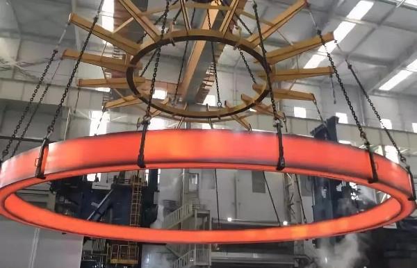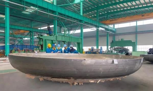 2019年3月12日,世界上最大的无焊缝整体不锈钢环形锻件在伊莱特顺利轧制成功,该环件直径达15.6米,重达150吨,首次实现了百吨级金属坯分级构筑成形,这也是目前世界上直径最大、重量最大的整锻式不锈钢环形件。 09/大明重工首个大直径薄壁特材封头成功下线