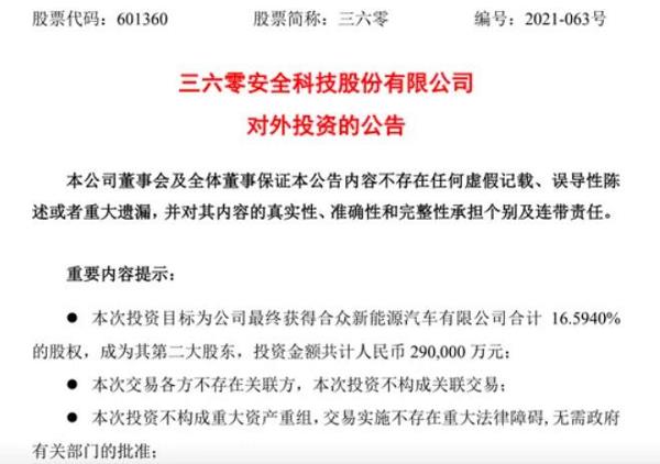 10月18日晚间,三六零安全科技股份有限公司(601360)(以下简称“三六零”)公告称,拟以自有资金共计人民币29亿元投资入股合众新能源汽车有限公司(以下简称“哪吒汽车”),投资全部完成后,公司将间接合计持有哪吒汽车16.5940%股权,合计成为哪吒汽车第二大股东,但本次交易不会导致公司的合并报表范围发生变化。