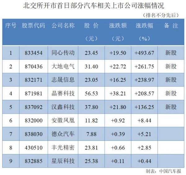 汽车制造相关企业有“靓”点 据了解,此次的81家上市公司中市值超过110亿元者只有4家,其中有3家是汽车制造相关企业,分别是贝特瑞,市值833.31亿元;连城数控市值258.36亿元;长虹能源市值112.55亿元。 北交所开市之际,几乎所有上市公司均出现迅速拉升,之后伴随大盘曲线的下行表现不一。截至当日收盘,十只当日上市的新股依然“火势”不减,另71只从新三板平移至北交所的股票中有9家企业保持上涨,其中有3家汽车零部件企业,1家为汽车销售企业,占比约44%。 其中,在上涨的9只股票中,安徽凤凰涨幅达8.44%;德众汽车涨幅达5.21%;丰光精密涨幅达2.85%;星辰科技涨幅达0.44%。 “在一定程度上,这几家汽车制造相关企业正是北交所上市同行公司的代表,且在各自不同的领域有独家或创新技术等优势。”招商证券分析师马宏图向《中国汽车报》记者对上述企业作出分析: 一是拥有自己的“绝活”,如丰光精密主要产品包括汽车伺服电机主轴等精密加工件,其压铸产品的精度公差最高能控制在±0.02毫米以内,优于国内同行。今年前三季度,该公司实现营业收入1.95亿元,同比增长48.69%;实现净利润为0.39亿元,同比增长59.74%。在原材料涨价等不利因素下,已属难能可贵。 二是产品虽小却利润较高。如安徽凤凰主要产品是汽车滤清器,包括空气滤清器、空调滤清器、机油滤清器、燃油滤清器等。公司约60%的产品销往国外,40%在国内,且境外的毛利率一直高于境内。国内主打小批量、多品种、灵活机动、利润率高的售后服务市场。 三是积极布局汽车新技术新赛道,如星辰科技的产品是新能源汽车驱动电机,以及无人驾驶物流车(AVG)、特种电动汽车的驱动电机及驱动系统,最新重点布局方向是多类电动汽车的驱动控制总成等。 “通常情况下,能在大盘下行之时仍然保持上涨,表明这些汽车制造相关企业具有较强的实力。”华泰证券分析师凌岳斌向《中国汽车报》记者表示,从新三板精选层平移至北交所的71家上市公司,虽然都是中小企业,但“专精特新”属性比较强,很多是制造相关行业细分领域的“隐形冠军”,表现出很强的成长性,由此也吸引了资本的关注。 新股领涨成“网红”? 当日,在北交所新上市的十只新股全部上涨。其中有五家汽车相关企业。截至当日收盘,这五家上市公司涨幅均超过130%。其中,汽车传动轴及相关零部件公司同心传动大涨493.671%,领涨北交所股票;大地电气涨幅达261.75%,居第二位;志晟信息涨幅达238.97%;晶赛科技涨幅达208.57%;汉鑫科技涨幅达136.25%。 “为资本所追捧的这几家新上市的汽车制造相关企业,基本都是为汽车‘新四化’配套的零部件企业。”东方证券分析师覃筱鹏向《中国汽车报》记者分析了这几家企业的特点。 其一,拥有高新技术的优势突出。如同心传动专注于汽车传动轴的研究与开发,公司拥有相关专利数十件。晶赛科技拥有自研的石英晶体谐振器,用于汽车GPS定位、雷达等器件,主要下游客户为比亚迪、华为等。而且正在研发先进的热敏晶体振荡器、温度补偿晶体振荡器等先进技术。其超薄型SMD石英晶体谐振器产品获安徽省科学技术奖。 其二,瞄准前景良好的新兴领域发力。如志晟信息是自动驾驶汽车的车路协同系统、以及智慧交通、智慧城市系统的供应商。而汉鑫科技则是平台供应商,其业务覆盖车路协同管理,技术服务平台涵盖驾驶安全、交通效率、交通信息服务等,可实现前向碰撞预警、紧急制动预警等典型应用,并利用该平台将“人、车、路、云”形成实时信息交互,从而带来更安全、更高效的自动驾驶及智慧出行。 其三,紧跟“新四化”新领域进行技术创新,如大地电气不仅有汽车成套线束、发动机线束、功能线束等,还积极布局新能源汽车充电枪、充电宝等组件的技术创新,并已经拥有了北京汽车、北汽福田、东风柳汽、中国重汽、潍柴集团、上柴集团等国内一流整车用户。 “北交所开市当日上午,包括上述几家汽车制造相关企业在内的十只新股全部‘熔断’临停,表明了资本对新技术特别是代表发展趋势的汽车零部件等行业的肯定和热情。”中信证券分析师路海波在接受《中国汽车报》记者采访时认为。
