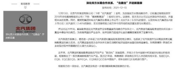 12月13日,北汽集团宣布,为加强双方长期战略合作,已经通过继续投资在2019年持有戴姆勒股份公司9.98%股份。这表明,双方充分认可过去长期合作的成功,并重视未来的发展。同时,戴姆勒集团持有北京汽车9.55%的股份,以及持有北汽蓝谷2.46%的股份,交叉持股将助力双方在中国市场的高质量发展与长期成功。北汽集团表示,根据协议,北汽集团没有进一步增持戴姆勒集团股票的计划。![]() 北京汽车与戴姆勒渊源已久,自2003年以来,戴姆勒和北汽集团之间就建立了长期的战略合作伙伴关系。此后,双方于2005年成立合资企业北京奔驰汽车有限公司,双方通过北京梅赛德斯-奔驰销售服务有限公司联合销售汽车。2012年,北汽集团控股的北汽福田汽车股份有限公司与戴姆勒成立合资企业,生产中重型卡车。 2013年,北汽集团和戴姆勒就提出了双方交叉持股的方案,这项方案也被称为“北戴合”的合作,并约定在戴姆勒持股北汽股份之后,北汽也将入股戴姆勒。2013年,戴姆勒斥资收购北汽集团旗下香港上市公司北京汽车股份,并自此成为北京汽车董事会成员,目前持股比例为9.55%。2018年,北京奔驰收购北汽集团位于北京顺义的一座工厂。同年,戴姆勒收购北汽集团旗下北京新能源汽车股份有限公司部分股份,目前戴姆勒目前持股2.46%。 ![]() 2019年7月23日,北汽集团宣布,为加强双方长期战略合作,投资戴姆勒股份公司,持有戴姆勒股份公司5%股份。本次交易包含2.48%的直接持股以及获得额外等同于2.52%股份投票权的权利。此次投资戴姆勒,北汽集团成为戴姆勒第三大股东,而彼时戴姆勒最大股东为吉利汽车,持有9.69%股份。 2018年2月,吉利集团宣布,通过旗下海外企业主体收购戴姆勒股份公司9.69%,一举成为戴姆勒最大股东。吉利在成为戴姆勒大股东后,2019年3月双方宣布在中国成立合资公司,各持股50%,在全球范围内联合运营和推动smart品牌转型,将smart打造成电动智能汽车品牌,并在中国的全新工厂生产,预计2022年开始投放市场并销往全球。