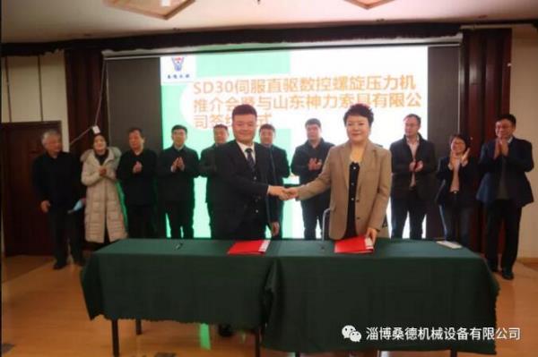 12月19日,山东圣德智能装备有限公司SD30伺服直驱螺旋压力机推介会暨与山东神力索具有限公司签约仪式在淄川举行。来自淄川区、淄川经济开发区的有关领导;来自中国机械总院北京机电研究所、中国机械总院郑州研究所、太原科技大学、精密成形国家工程研究中心济南研究院的多位专家,来自山东省装备制造业协会、山东省锻造行业协会、淄博市装备制造业协会、淄博西北商会等行业协会的专家领导,以及山东神力索具有限公司等合作方企业代表等,共100余人参会。