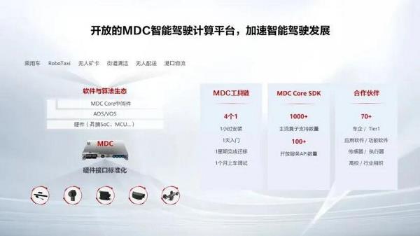 华为智能汽车解决方案BU 智能车控领域总经理蔡建永指出,智能汽车要回归汽车服务于人的初心,需要一个面向智能汽车的可持续进化的架构,在设计理念上应以人为本,围绕着用户体验和OEM商业成功的持续创新。这里面四个特征尤为关键: 第一, 软件可升级,软件可跨车型、跨平台、跨车企重用,支持快速开发 持续发布; 第二, 硬件可伸缩,硬件可扩展、可更换,传感器等外设可即插即用; 第三, 安全可保证,构建整车级数字安全与纵深防御系统,支持Fail Operational; 第四, 商业可持续,让车成为可持续保值增值平台,全生命周期投资回报最优。 不过,要真正实现软件定义汽车,需要全产业的共同努力。为此中国汽车工业协会在去年12月21日联合22家初创成员成立了SDV工作组,目标是协同整车厂、零部件企业,推动智能汽车软硬件接口标准化,降低智能汽车研发复杂度,做强智能汽车产业链。 截至目前,SDV工作组已经有70多家成员单位加入,覆盖了20家整车厂、50多家上下游企业,包括国内外零部件供应商、汽车应用软件开发公司、基础平台提供商、汽车工程公司等。大家围绕SDV工作组工作目标,经过一年多的共同努力,已经发布了软件定义汽车原子服务API和设备抽象API,包括车身控制、热管理API正式稿1.0,运动控制、能量管理、底盘域、动力域征求意见稿。 华为作为SDV工作组的重要成员之一,基于标准化接口规范,也在积极协同相关工作的推进。据蔡建永介绍,华为已经协同SDV工作组成员单位围绕分层解耦架构完善SDV API规范于2021年Q2发布了车身域和热管理域原子服务设备抽象API征求意见稿,Q3正式发布了这两个领域的版本。 2021年10月份进一步发布了能量管理、运动控制的原子服务以及动力域和底盘域的设备抽象征求意见稿,目前正在组织工作组成员单位研讨和评审。根据目前的规划,2022年Q1将正式发布这几个领域的API,Q2计划发布智能服务1.0的版本,包括图像识别服务、感知服务、定位服务、配套发布各类传感器设备抽象API,如摄像头、毫米波雷达、激光雷达等,并针对高阶车身域功能,配套发布2.0版本,如电动门、零重力座椅、随动大灯等。 2022年Q4,华为还将协同相关企业持续更新已有发布的各域能力,推出2.0版本,比如悬架控制、无线充电、车车充电、进气格栅控制等。中汽协SDV工作组协同行业组织和企业单位旨在共建、共享、共创统一的整车级API,确保有序推进,迭代更新 持续发布。 MDC生态:加速智能驾驶发展 华为MDC生态主要围绕MDC智能驾驶计算平台展开,该平台可为开发者提供全场景覆盖的工具链与丰富的SDK,支持伙伴的软件开发和移植,同时满足智能驾驶应用对车规、安全的核心要求。 作为华为在智能驾驶领域的重磅之作,华为于2019年正式推出MDC 300F,开启了MDC生态建设。之后2020年北京车展和2021年上海车展上,华为分别发布了MDC 210与610以及MDC 810。根据规划,2022年华为将发布MDC 100,从而逐步覆盖高、中、低全系列。