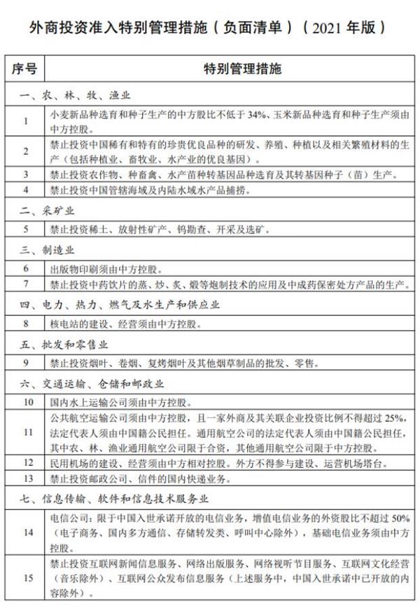 国家发展改革委、商务部于今日发布《外商投资准入特别管理措施(负面清单)(2021年版)》和《自由贸易试验区外商投资准入特别管理措施(负面清单)(2021年版)》,自2022年1月1日起施行。