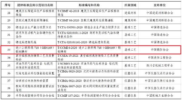 2021年12月30日,工业和信息化部公布111项2021年团体标准应用示范项目,中国锻压协会发布的T/CCMI 6-2020《进口三联熔炼718(GH4169)锻制棒材》团体标准成功入选。