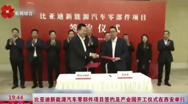 12月5日,比亚迪新能源汽车零部件项目签约及产业园开工仪式在西安举行。省委书记刘国中、省长赵一德会见比亚迪董事长王传福一行并出席签约及开工仪式。省委副书记胡衡华,省委常委、西安市委书记方红卫,副省长程福波,西安市市长李明远参加。该项目落户西安市高新区,将有力推动我省新能源汽车产业、先进制造业产业集群持续健康发展。