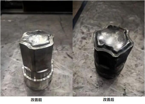模具制造工段立足于工作中实际的问题,创新性地提出了对三销轴叉三工位冲头进行二次开发利用。改善前的情况是三销轴叉三工位冲头使用寿命达到工艺标准后,直接报废,模具制造的工程师经过数次尝试以及严格验证后发现将寿命达到工艺标准的冲头,进行降面处理,处理后的冲头可二次使用,寿命与新冲头一致,这意味着按照预算产量计算,全年需消耗轴叉三工位冲头约450个,若进行降面处理二次利用,则只需225个。降面处理加工与毛坯加工相同,加工价格一样,降面处理二次利用一个冲头相当于节约一个毛坯冲头,全年节约金额预估约为五十余万。