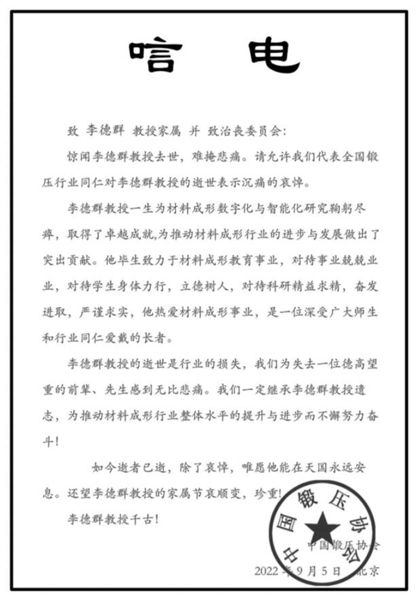 据华中科技大学官网消息,中国共产党党员、我国著名材料成形专家、中国工程院院士、全国高校黄大年式教师团队负责人、全国优秀科技工作者,华中科技大学材料科学与工程学院教授李德群同志,因病医治无效,于2022年9月5日10时34分,在武汉不幸逝世,享年78岁。
