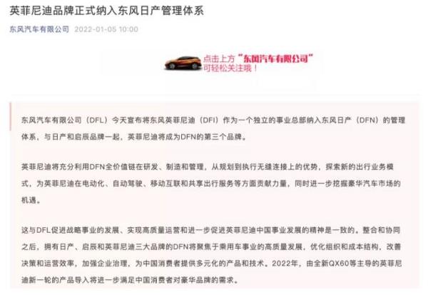1月5日,东风汽车有限公司(下称“东风有限”)宣布,将东风英菲尼迪作为一个独立的事业总部纳入东风日产的管理体系,与日产和启辰品牌一起,英菲尼迪将成为东风日产第三个品牌。