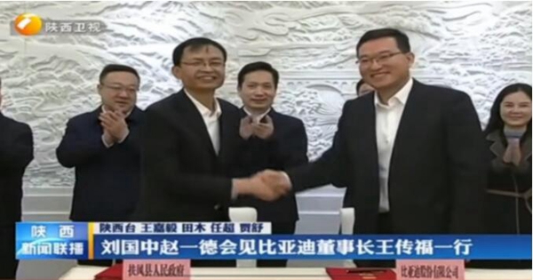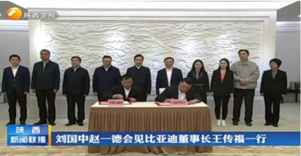 11月9日,陕西省委书记刘国中在西安会见了比亚迪董事长王传福一行。省长赵一德出席宝鸡市政府与比亚迪战略合作协议比亚迪新能源汽车零部件基地项目签约仪式。省委常委、省委秘书长李春临,省委常委、副省长王琳参加活动。