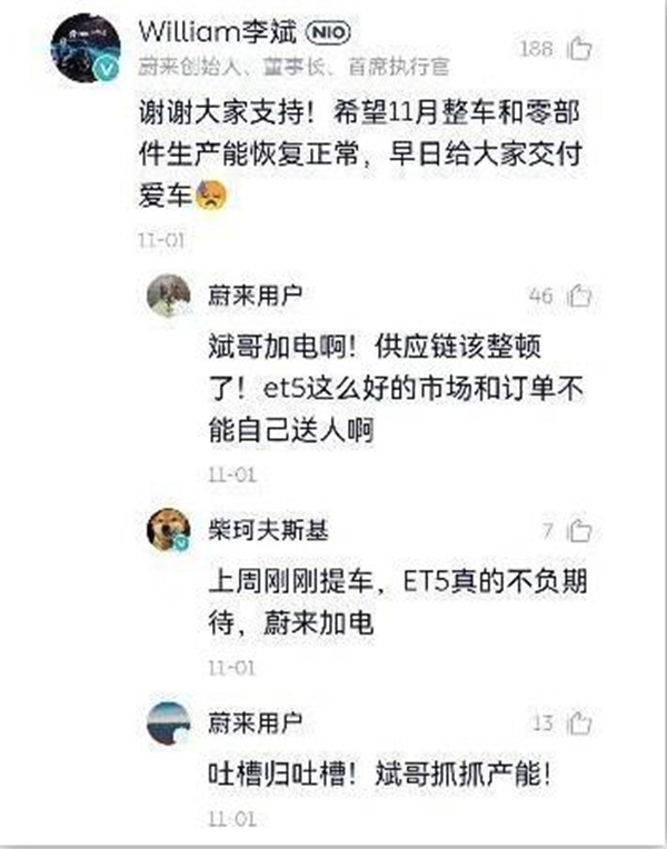 日前,有消息称,受疫情防控要求影响,蔚来位于合肥的两座工厂相继停产,目前旗下车型的交付进度普遍延缓。“生产(方面)受疫情影响确实比较严重。”11月2日,蔚来方面在接受《每日经济新闻》记者采访时回复称。 11月2日,安徽卫健委通报,2022年11月1日0~24时,安徽省报告无新增确诊病例,新增无症状感染者5例(合肥市肥东县1例、庐阳区1例、包河区3例,均为在隔人员)。 而蔚来两个工厂皆地处合肥市,其中江淮蔚来第一工厂位于合肥市包河区宿松路;蔚来第二工厂则位于合肥新桥智能电动汽车产业园区内。 事实上,早在今年4月,蔚来就曾因疫情导致供应链中断而停产5天。4月9日,蔚来在其官方APP上发布消息称,自3月份以来,因为疫情原因,公司位于吉林、上海、江苏等多地的供应链合作伙伴陆续停产。受此影响,蔚来整车生产已暂停。“一辆车差一个零件都没法生产。”蔚来董事长李斌曾第一时间回应称。 目前,蔚来已交付的车型共计6款,除早期推出的ES8、ES6、EC6外,还有2022年全新上市的ET7、ES7以及ET5。其中,全新投产的蔚来第二工厂规划产能30万辆,首款生产车型即为ET5,已于9月30日开启交付。而江淮蔚来工厂则承担其他5款车型的生产,产线升级后最高产能可达30万辆。 “10月生产基地受疫情影响比较严重,部分用户交付时间延后,对此我们表示歉意。”11月1日,蔚来用户运营高级副总裁魏健在蔚来APP上称,“我们会努力克服困难,为用户朋友们加速交付爱车。” 据36氪报道称,10月中旬以来,蔚来生产开始面临挑战,江淮蔚来第一工厂为配合防疫原计划关3~5天,但因为大部分零部件都备有库存可以封闭式生产,随着封控时间延长,整体生产和交付的节奏都受到较大影响。而蔚来第二工厂也于近期同样处于封闭管控,且整车生产线也暂停运转。 官方数据显示,今年前10个月,蔚来累计交付约9.25万辆。其中,10月,蔚来交付新车10059辆,同比增长174.3%。“我们的汽车生产和交付受到了部分地区疫情带来的工厂运营挑战及供应链波动影响。”蔚来方面坦言。 生产及交付步伐的放缓,使得不少车主开始催促蔚来方面交付新车。对此,李斌在蔚来APP上回复车主称,“希望11月整车和零部件生产能恢复正常,早日给大家交付爱车。”