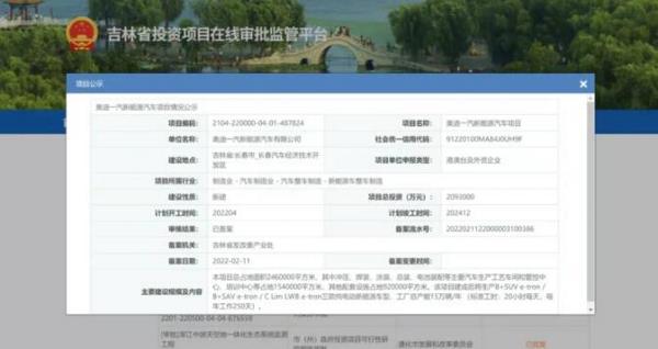 奥迪与一汽合资的新能源汽车项目(下称奥迪一汽)有了最新进展。2月11日,吉林省投资项目在线审批监管平台发布的奥迪一汽新能源汽车项目备案公示显示,双方投资209亿元打造的新能源工厂将与4月正式开工,预计竣工时间为2024年12月。该项目占地面积246万平米,规划年产能15万辆,建成后将生产三款纯电动新能源车型。